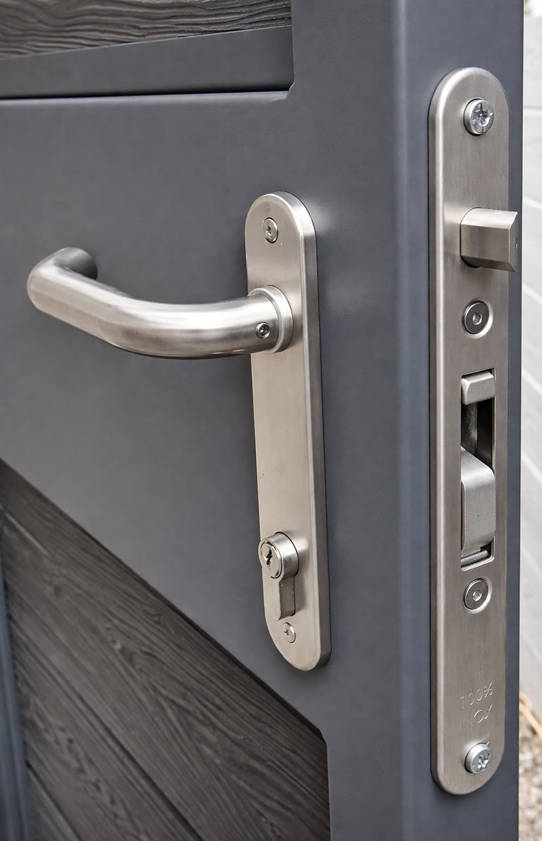 All Gates are supplied with High security locks in Stainless steel and Handles in either stainless steel or Aluminium with a Black Powder coated finish.
